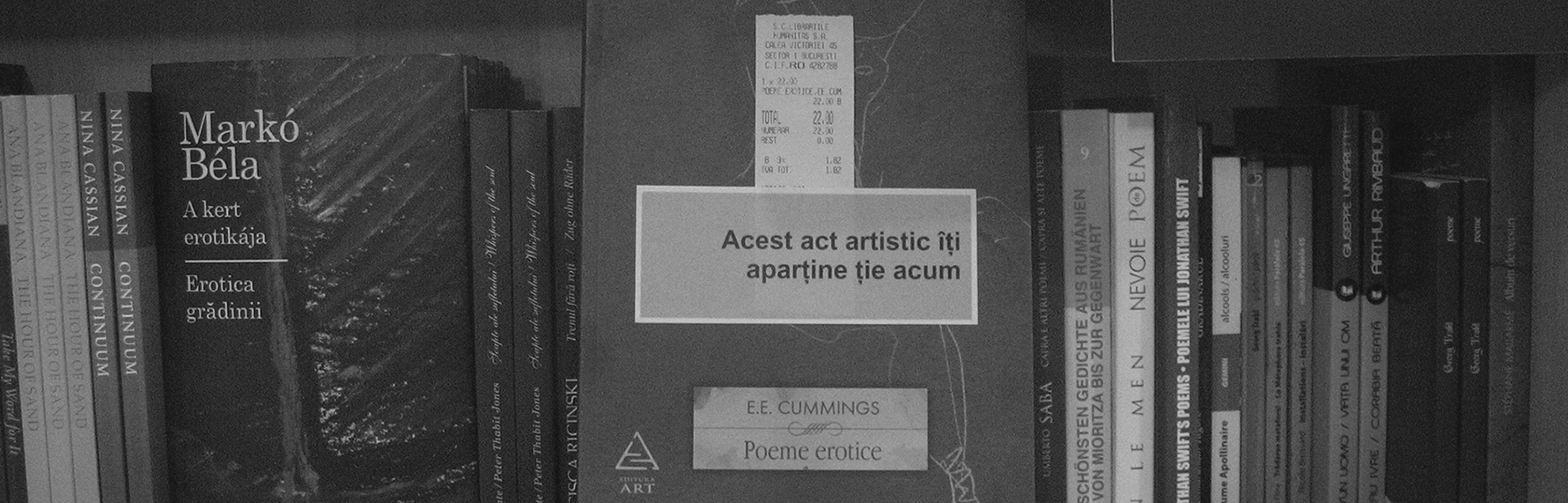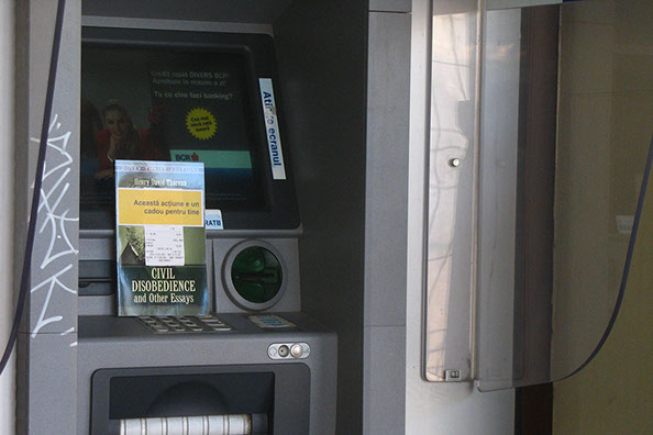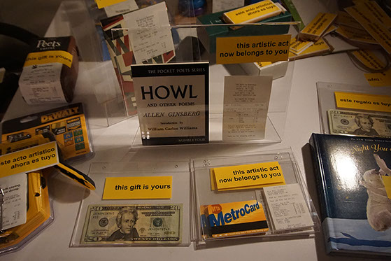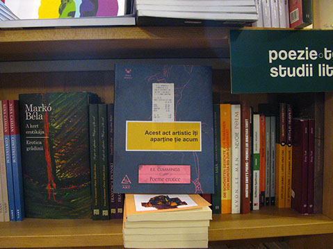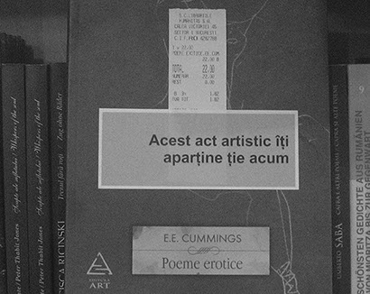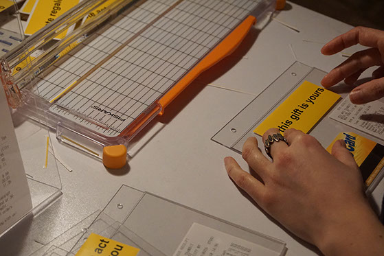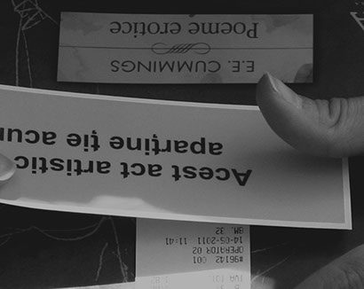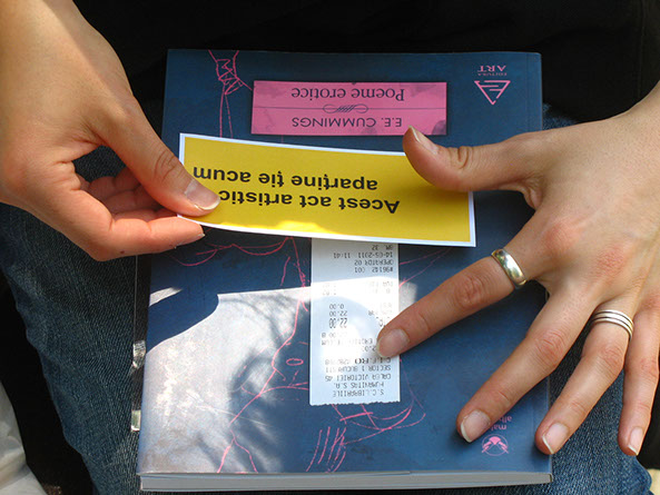 The action Displacement Pills deals with the poetics of offering gifts to strangers at places designed for consumption: a book written by Baudelaire can be left at a sex shop booth; a $10 bill can be left on an ATM machine, or a chocolate box can be left on the shelf of a supermarket. The gift-capsules are labeled as “This gift is yours” or “This artistic act now belongs to you”. All the gifts contain the receipt of its purchase.