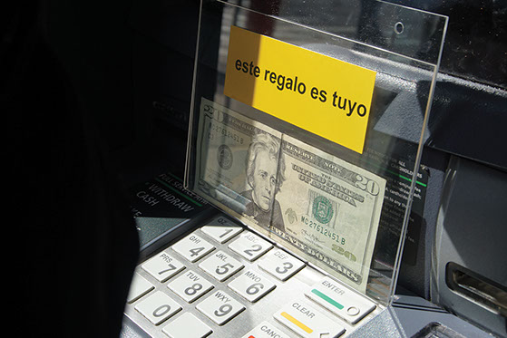 a sex shop booth; a $10 bill can be left on an ATM machine, or a chocolate box can be left on the shelf of a supermarket. The gift-capsules are labeled as “This gift