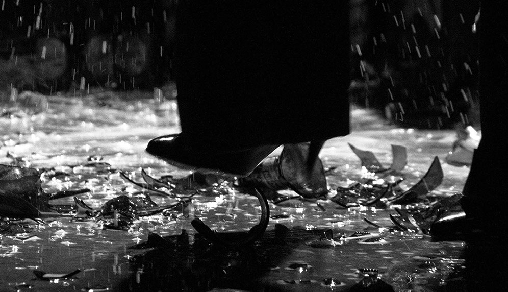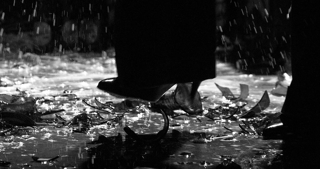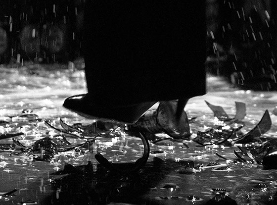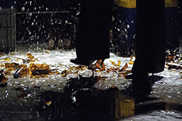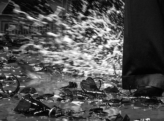 with glass shards and liquid. The high heels enhance the risk of falling, requiring absolute balance and an attuned state of presence.