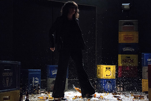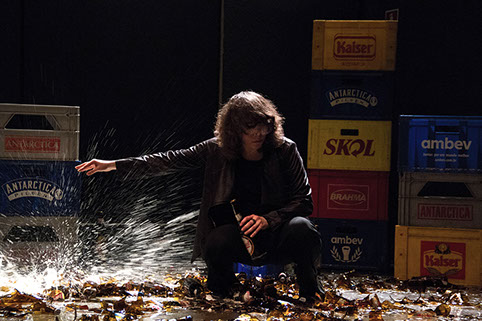 I criticize, the sonata imprints itself through the continuous alteration of the topography of the space, generating a hazardous environment with glass shards and liquid. The high heels enhance the risk of falling, requiring absolute balance and an attuned state of presence. In Unbeer Sonata the body must overcome the topography it creates.